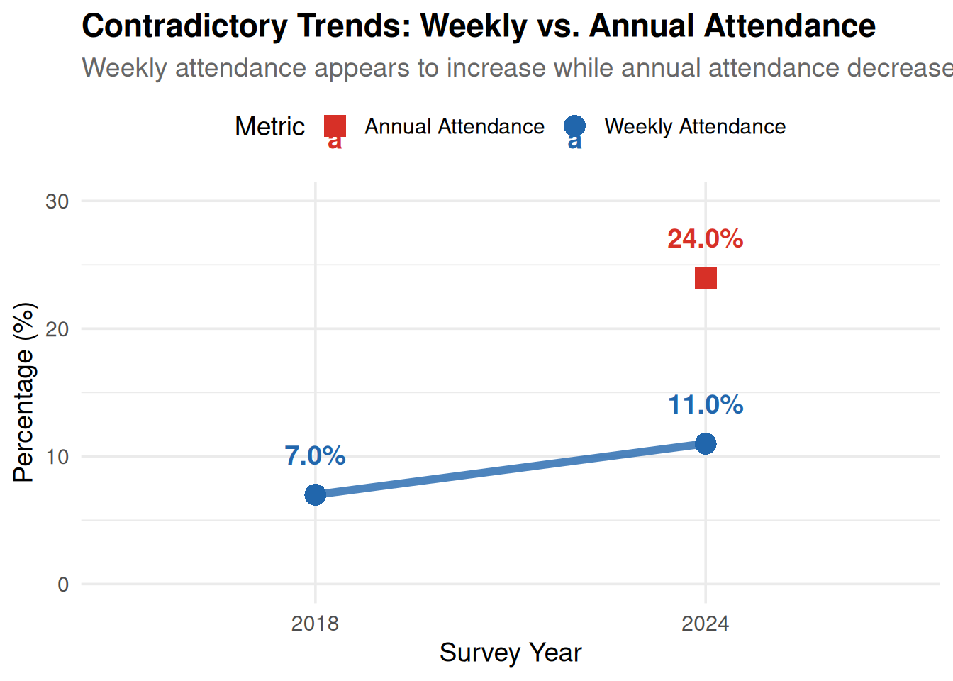 - Inflate the weekly attendance figure in 2024 due to acquiescence bias