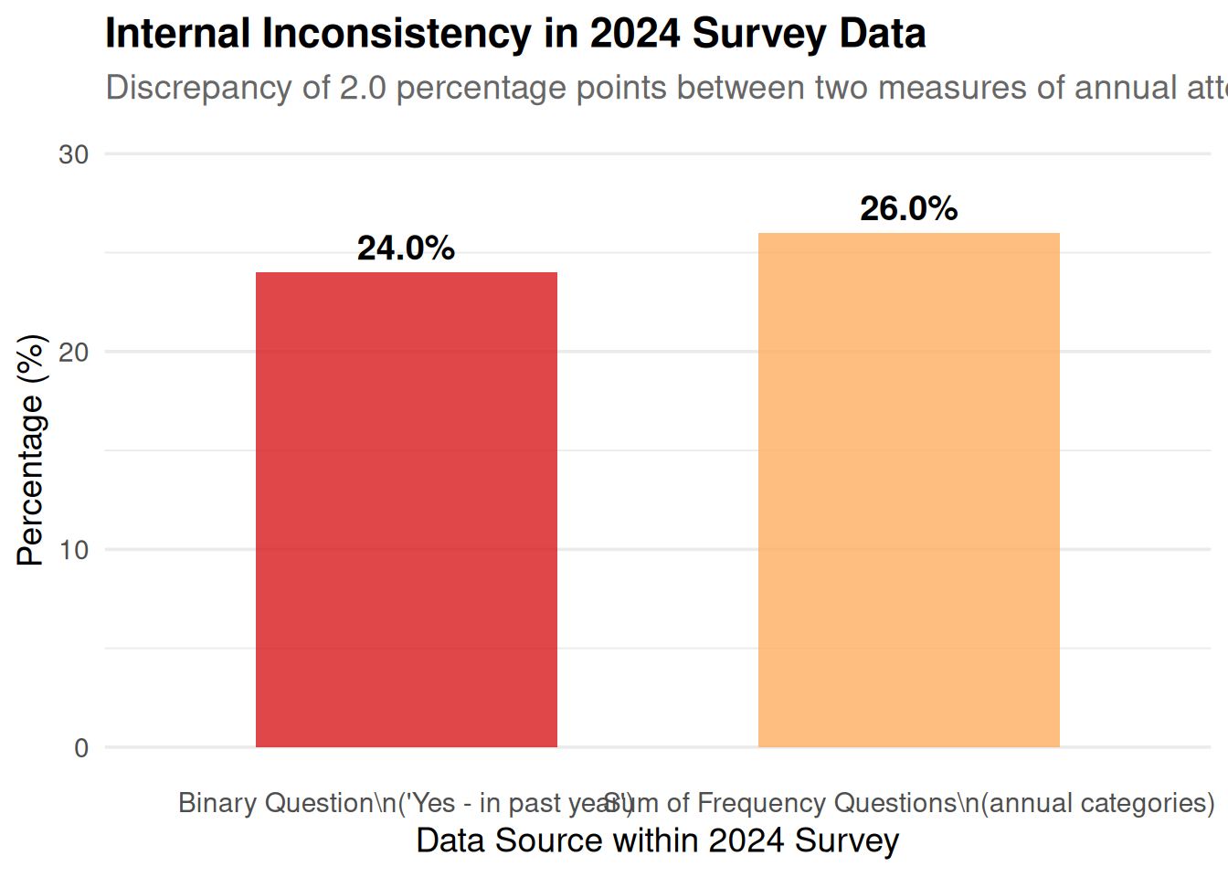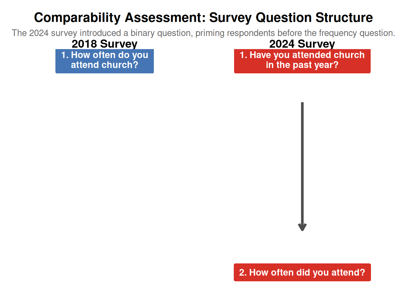 The most significant methodological flaw is the change in question structure between the two surveys. The 2018 survey asked a single question about frequency, while the 2024 survey first asked a binary yes/no question before asking about frequency. This change introduces a “priming” effect that makes the results from the two years not directly comparable. The chart below illustrates this structural difference.