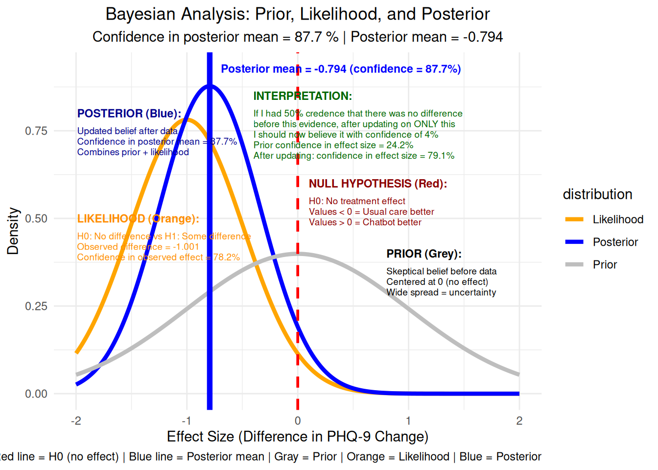label = paste0("After updating: confidence in effect size = ", round(dnorm(observed_diff, posterior_mean, posterior_sd) * 100, 1), "%"), size = 2.5, hjust = 0, color = "darkgreen") +