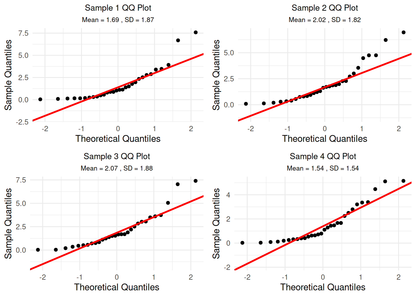 Important Note: The samples are drawn from the original population distribution (exponential in this case). What you’re seeing is the sampling distribution of the means, which is different from the original population distribution. This is exactly what the Central Limit Theorem predicts - even though we’re sampling from a skewed exponential distribution, the distribution of sample means becomes approximately normal!