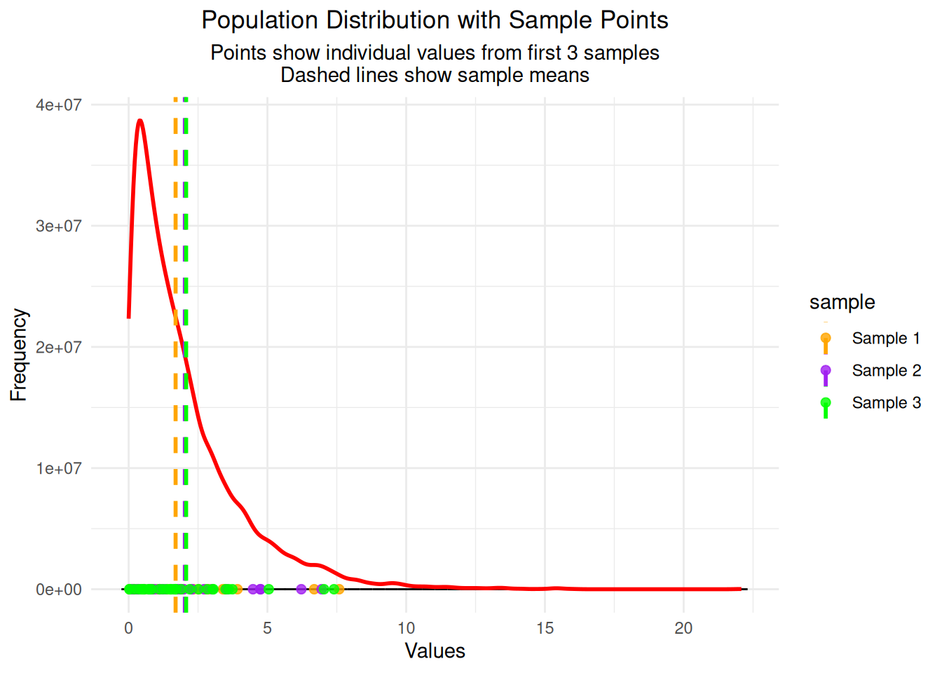 subtitle = "Points show individual values from first 3 samples\nDashed lines show sample means",